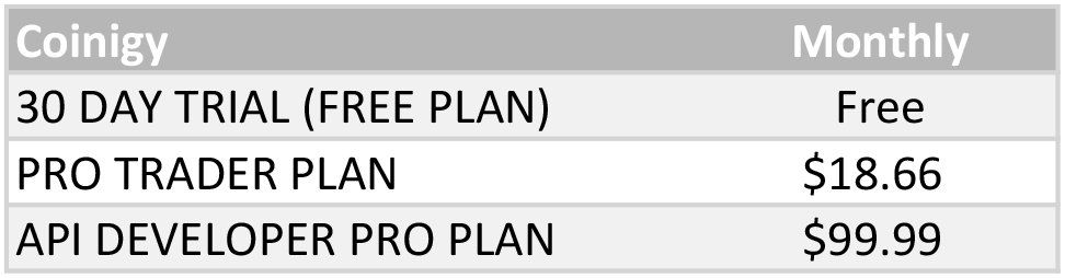 پلتفرم Coinigy به معامله گران اجازه می دهد تا استراتژی های معاملاتی را با کمک بیش از ۱۳۰ شاخص فنی سفارشی کنند. Coinigy با CryptoTrader همکاری کرده است تا امکان واردکردن تاریخچه تراکنش ها و ایجاد گزارش مالیات ارز دیجیتال برای سرمایه گذاران و معامله گران را فراهم شود. همچنین این پلتفرم میتواند این گزارشهای مالیاتی را با متخصصان مالیاتی به اشتراک بگذارد. Coinigy از بیش از ۵۰۰۰ دارایی دیجیتال و جفت معاملات فارکس پشتیبانی می کند و به بازارهای مالی مختلف جهانی دسترسی دارد.