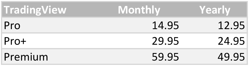 تریدینگ ویو دارای سه سطح قیمت گذاری مختلف است و می توانید بین پرداخت های ماهانه و سالانه یکی را انتخاب کنید.